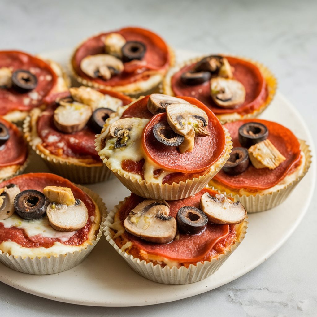 For toppings, I use 2/3 cup of marinara or pizza sauce and 1 cup of shredded part-skim mozzarella cheese. Sometimes, I add 1 ounce of chopped turkey pepperoni for extra taste. I also like to include diced bell peppers, black olives, mushrooms, and fresh basil or pesto. These toppings make the bites tasty for any event.